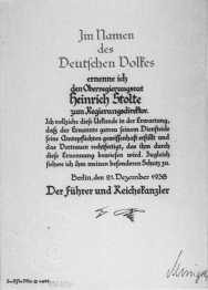 21.12.1938 Laut Ernennungsurkunde vom heutigen Tage und mit Wirkung vom 1.12.1938 zum Regierungsdirektor ernannt.