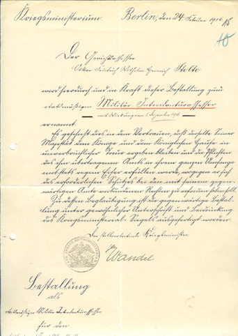 24.2.1916 Durch Bestellung vom heutigen Tage u. m. Wirkung vom 1.12.1915 z. etatmässigen Militärintendaturassesor ernannt.