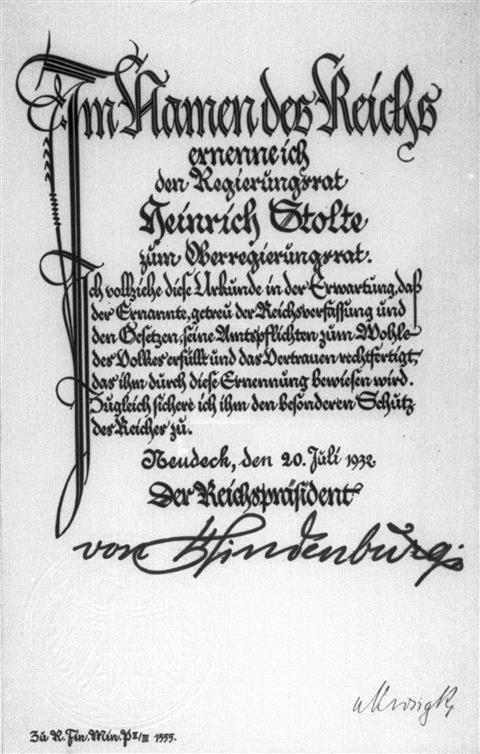 20.7.1932 Mit Wirkung vom 1.7.1932 zum Oberregierungsrat ernannt, unter Versetzung zu der Abtlg. f. Besitz- u. Verkehrssteuem des Landesfinanzamts Stettin.