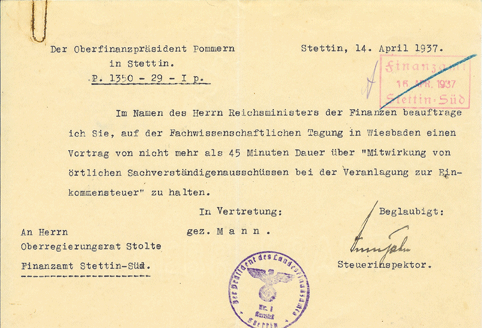 3. — 8. 5.1937 Zur fachwissenschaftlichen Tagung nach Wiesbaden abgeordnet mit dem Auftrage, dort vor rd. 1200 Teilnehmern des Reichsfinanzminesteriums, des Reichsfinanzhofes u. d. Landesfinanzämter einen Vortrag über die auf meine Veranlassung in Pommern durchgeführte Mitwirkung örtlicher Sachverständigenausschüsse bei der Einkommensteuer-Veranlagung zu haben.