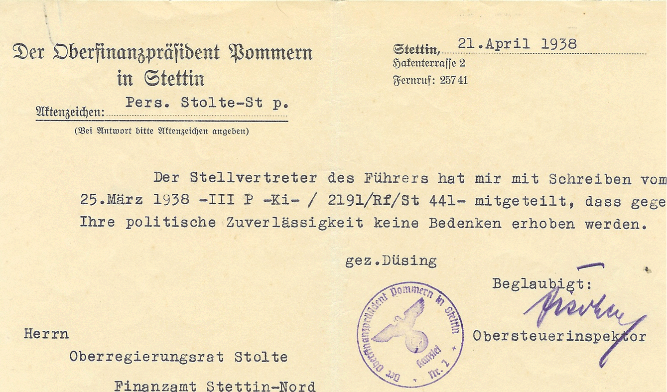 25.3.1938 Auf die von mir wegen meiner Nichtbeförderung zum Regierungsdirektor sofort erhobene Beschwerde teilt der Stellvertreter des Führers durch ein an den Oberfinanzpräsidenten Pommern gerichtetes Schreiben vom heutigen Tage mit, daß die gegen meine Person erhobenen Bedenken nicht weiter aufrechterhalten werden.