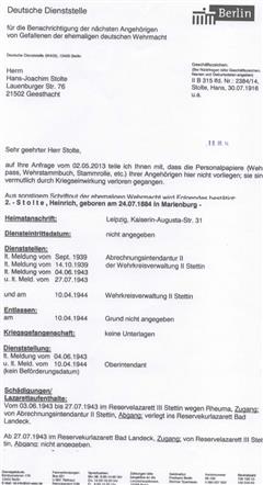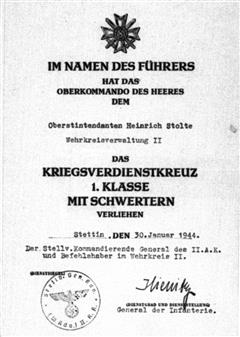 Die Urkunden und nationalsozialistischen Embleme dienen ausschl. der Zeitgeschichte und Dokumentation des Lebens von Heinrich Stolte und ist nicht dazu da, die verheerende Zeit zu verherrlichen. Als Millitärintendant im 1. Weltkrieg und Obersintendant im 2. Weltkrieg hat er zu keiner Zeit jemals eine Waffe gegen Menschen in der Hand gehabt. Er war immer froh darüber, dass er trotz Militärpflicht "nur" am Schreibtisch seinen Dienst als Militärbeamter und Intendantur-Offizier für die Beschaffung ziviler Güter, wie u. a. Verpflegswesen; Monturswesen; Geldwesen und Rechnungsdiens absolvieren konnte. Siehe auch dazu folgende Seite bei Wikipedia.Fronteinsätze kannte er als Intendant in den Schlachten des ersten Weltkrieges an der Ost- und Westfront (siehe oben).