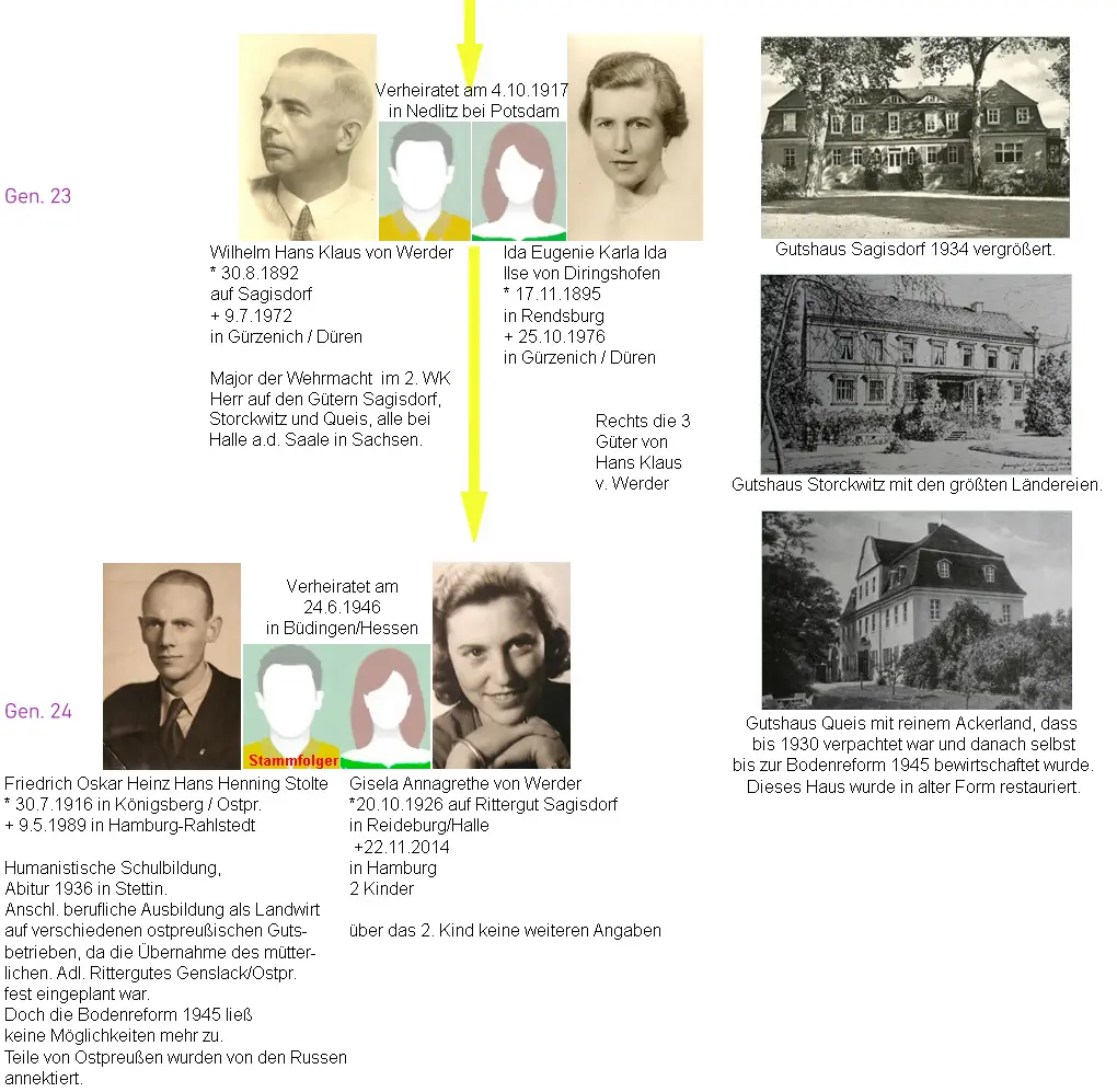 und Ida Eugenie Karla Ida Ilse von Diringshofen, *17.11.1895 in Rendsburg, † 25.10.1976 in Gürzenich/Düren (Großmutter mütterlicherseits des Autors dieser Website) Sie heiratete am 4.10.1917 den besten Freund und Regimentskameraden ihres gefallenden Bruders Siegfried, Hans Klaus von Werder in ihrem Elternhaus in Nedlitz/Potsdam.