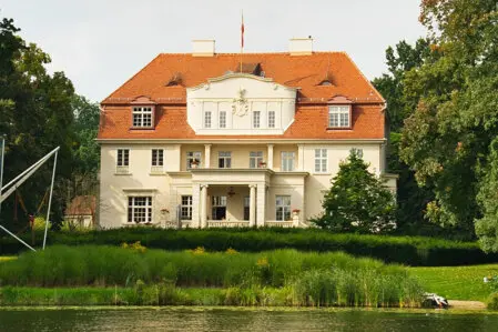 Am Ende der Straße Am Lehnitzsee gelegen, zeigt sich die Villa von Diringshofen als repräsentativer herrschaftlicher Wohnsitz in einem weiträumigen parkartigen Gelände.