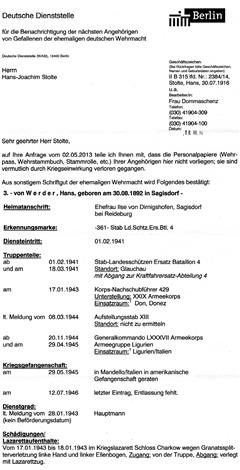 Die Werder´sche Chronik, aufgeschrieben von Vetter Wolfgang von Werder, endet mit den letzten Aufzeichnungen im Sommer 1939 hier. Wie wir wissen, folgte kurze Zeit darauf die plötzliche Mobilmachung zum 2. Weltkrieg. Ilse von Werder, geb. von Diringshofen blieb mit ihren beiden jüngsten Kindern zunächst auf dem Gutshof Sagisdorf und führte die Betriebe weiter. Ehemann Hans Klaus von Werder wurde mit den beiden älteren Söhnen zum Kriegsdienst von der Wehrmacht eingezogen. Der Jüngere von beiden — Hans Christoph — fiel am 22.10.1944 an der Ostfront. Der Vater wurde aus dem ehemaligen Oberleutnant (1. Weltkrieg) bis 1945 der Major von Werder. Er geriet noch kurz vor Beendigung des Krieges in amerikanische Gefangenschaft auf italienischem Boden und hat als Lager-Gefangenenkommandant, da er dem höchsten Dienstgrad im Lager als Major hatte, das Schicksal seiner Kamaraden zu erleichtern vermocht.