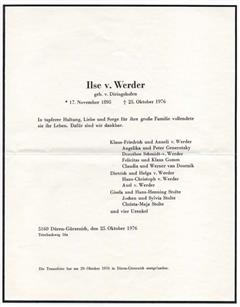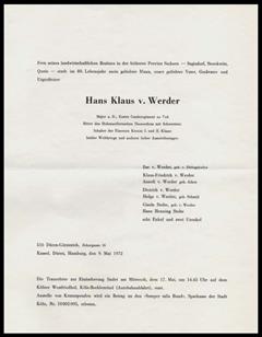 Der Werder'schen Familiengeschichte hat Hans Klaus von Werder bereits dem Biographen der 30er Jahre ein gutes Kapitel geliefert. Er wird dem nächsten Familienhistoriker eine Fülle weiteren Stoffes bieten, als ein Vorbild, dem spätere Generationen getrost nacheifern können."
