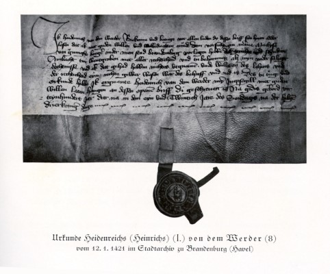 Im Lehnbuch des Erzbischofs Friedrich (III.) von 1445-1464 heißt es: „Heidenreich und alle anderen von dem Werder haben empfangen insgesamt zu einem menschlichen Lehen vom Erzbischof Friedrich (III.), Heinrich und Heise von Bardeleben haben 6 Hufe zu Belicke und Buchholz mit Zubehör und Kade.