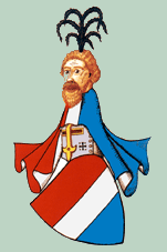 Wappen: Ist von Rot, Silber und Blau geteilt. Auf dem Helm mit rot-silber-blauen Helmdecken ein vorwärts gekehrtes Manneshaupt mit Helmkappe, die mit sieben bis zehn Hahnenfedern besteckt ist.