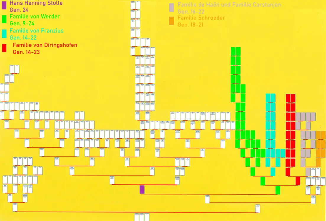 Die in der unterstehenden Grafik abgebildeten Personen sind alle eng verbunden. Wir finden über die Button 1-6 die Gruppen geordnet und übersichtlich wieder. Die Button 3 (von Frantzius), Button 4 (von Diringshofen) und Button 5 (de Haën, Carstanjen und Schroeder) sind angeheiratete Familien aus der Familie von Werder.